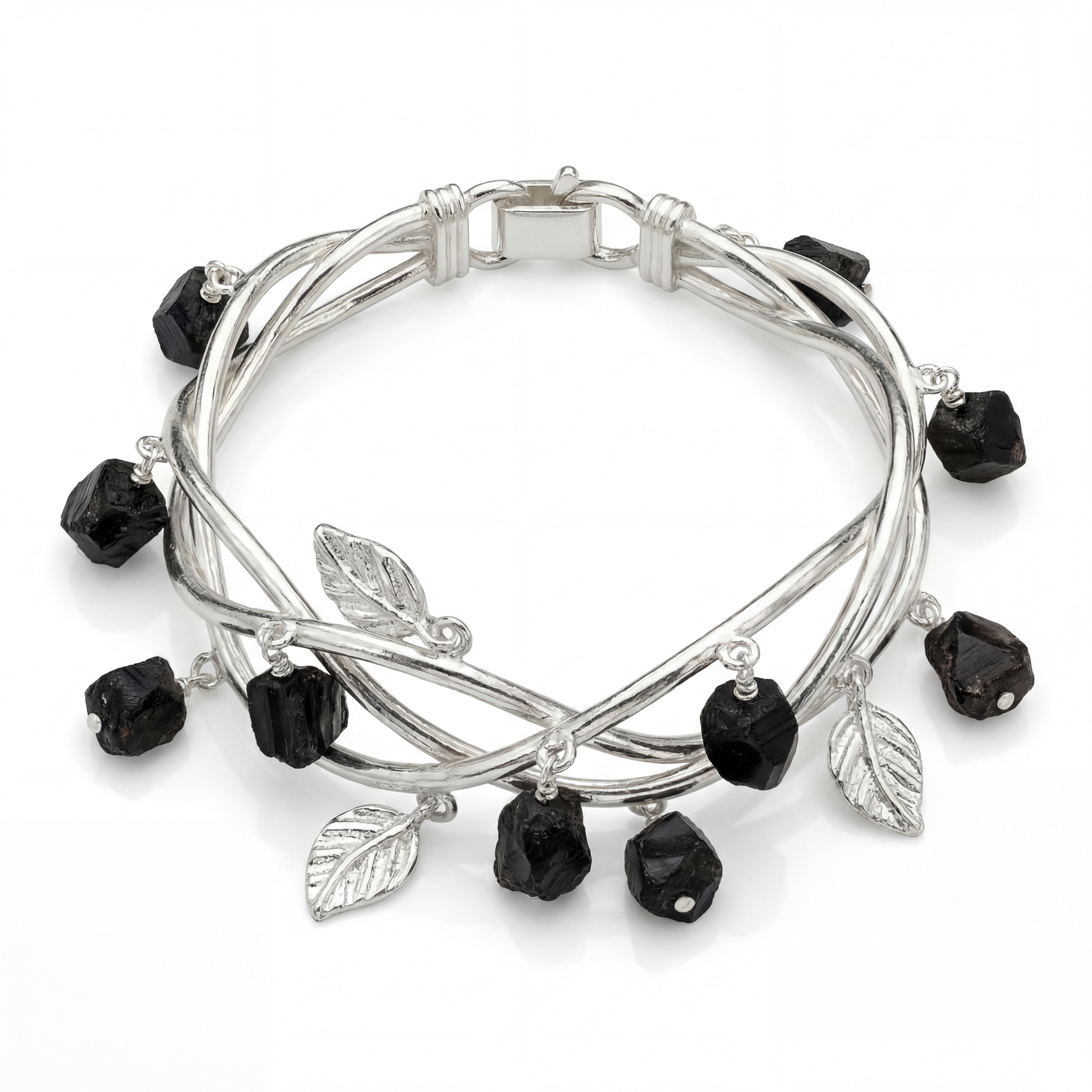Manú is a sculptural 950 silver cuff that feels alive on the wrist. Interlaced silver branches sweep around the arm in layered arcs, detailed with small leaf forms and finished in a bright, mirror polish. Faceted black stones are suspended as delicate charms, adding quiet movement and depth—dark flashes against luminous silver, refined without being precious.