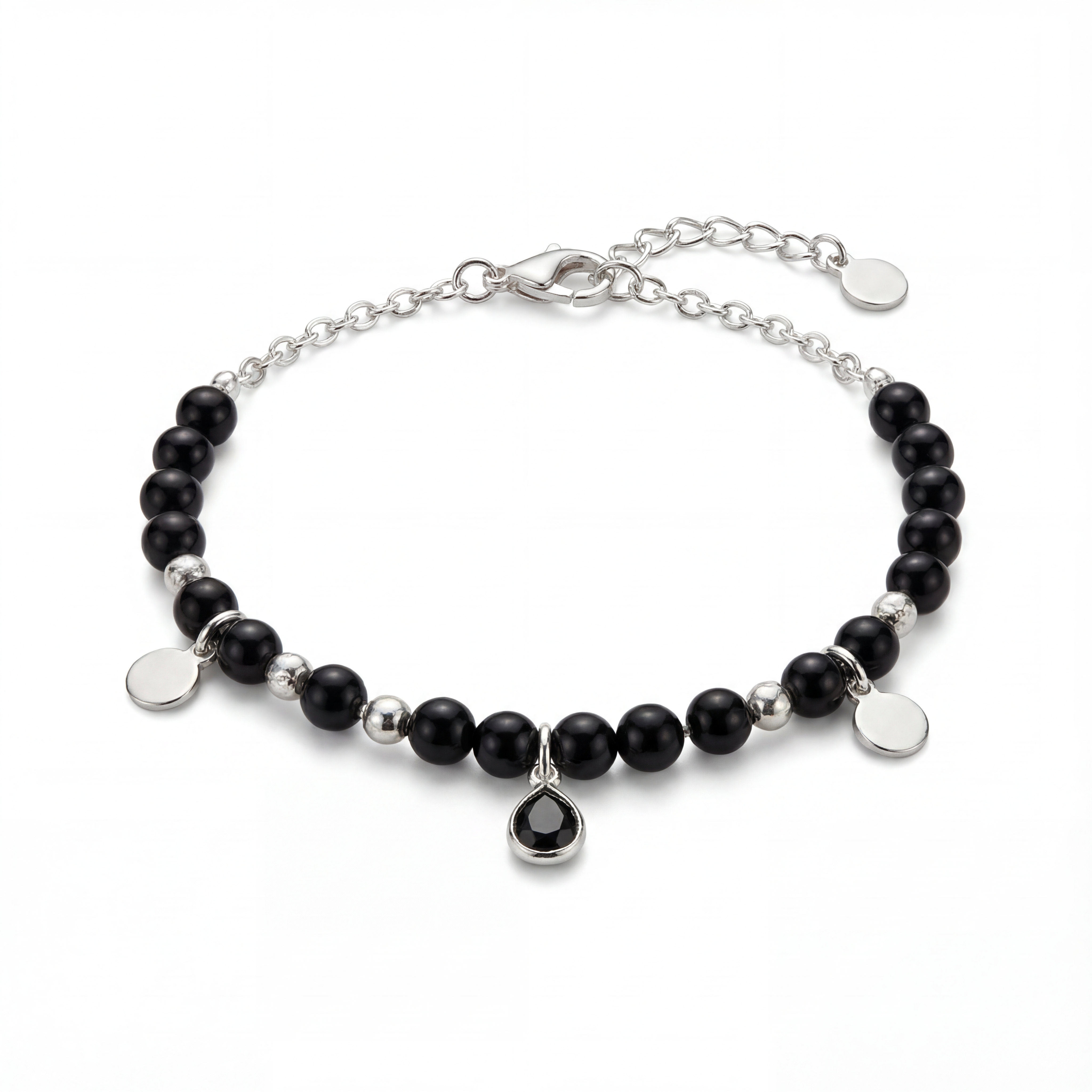 Nablé is a refined 950 silver bracelet built around clean rhythm and quiet contrast. Polished black beads are spaced with bright silver accents, then finished with two bezel-set drops that catch light with a restrained sparkle. The design is minimal but considered—dark gloss against luminous silver, with just enough movement to feel alive.
